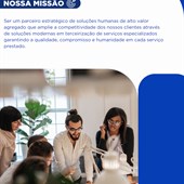 Ser um parceiro estratégico de soluções humanas de alto valor agregado que amplie a competitividade dos nossos clientes através de soluções modernas em terceirização de serviços especializados garantindo a qualidade, compromisso e humanidade em cada serviço prestado.