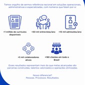 Com +25 anos de atuação, o Grupo SRM é referência nacional em terceirização de serviços operacionais, administrativos e especializados. Atuamos com soluções sob medida para que sua empresa tenha mais tempo, foco e tranquilidade para crescer com excelência. Por trás de cada número, existe uma equipe especializada, processos inteligen